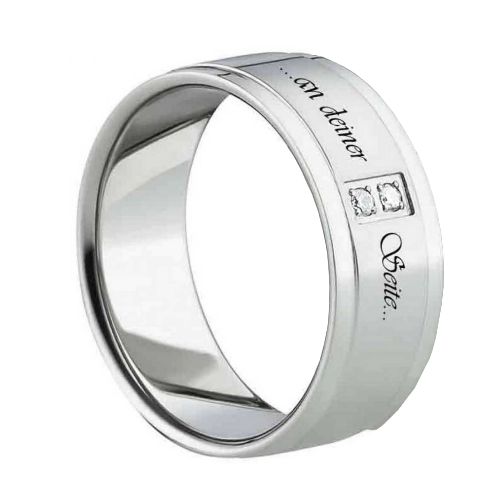 Durch gleich zwei abstufungen an der Außenfläche fallen diese Partnerringe aus Edelstahl sofort auf. Sie sind massiv und 8,0 mm breit. Die Oberfläche außen ist mattiert und die Innenfläche poliert und abgerundet, für ein angenehmes Tragegefühl. Ein weiteres Highlight sind die zwei runden 1,5mm große Zirkonia auf dem Damenring. Die Verlobungs- oder Partnerringe sind gravierbar. Dafür ist die polierte Fläche auf der Innenseite vorgesehen. Anhand von sieben verschiedenen Schriftarten kann man seine Botschaft ganz nach seinen Wünschen gestalten. Der Lieferumfang umfasst ein schwarzes Etui und die Versandkosten innerhalb von Deutschland. Die Ringe können auch als Verlobungsringe, Trauringe oder Freundschaftsringe getragen werden.