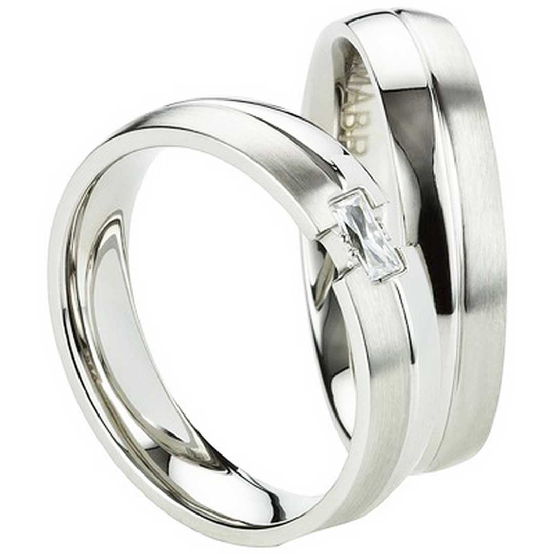 Auf dem Damenring dieser Partnerringe aus Edelstahl funkelt ein rechteckiger weißer Zirkonia. Die Ringe sind beide massiv und haben eine Breite von ca. 5,0 mm. Außen sind sie mattiert und poliert und auf der Innenfläche bombiert und poliert. Für eine gratis Gravur, die auf der Innenseite ihren Platz findet, stehen sieben Schriftarten und 30 Zeichen zur Verfügung. Drücken Sie damit Ihre innige Verbundenheit ganz einfach in Worte aus. Diese Botschaft wird mittels eines Lasers angebracht. Für den Versand steht eine Box für die Edelstahlringe zur Verfügung, die gratis mitgeliefert wird. Auch die Versandkosten innerhalb von Deutschland sind kostenfrei.