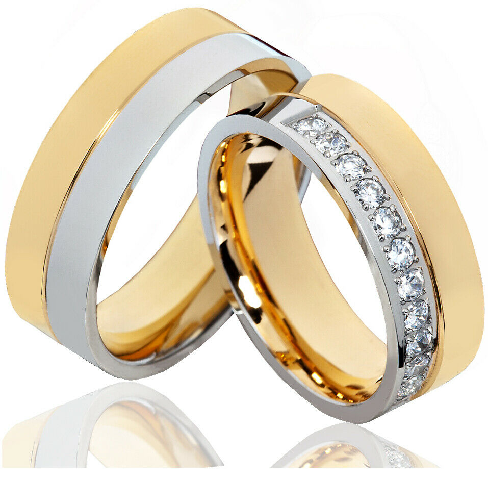 Erleben Sie zeitlose Eleganz mit diesen atemberaubenden Partnerringen aus hochwertigem Edelstahl. Die Ringe begeistern durch ihre teilweise goldfarbene Beschichtung auf Außen- und Innenfläche sowie die hochglanzpolierte Oberfläche. Der Damenring funkelt mit 11 weißen Zirkonias (je 2 mm), während der Herrenring schlicht und maskulin ohne Stein überzeugt. Beide Ringe sind gravierbar und lassen sich mit Namen oder persönlichen Botschaften in sieben verschiedenen Schriftarten individuell gestalten – ein perfektes Symbol für Ihre Liebe. Geliefert werden die Ringe in einem eleganten Etui, versandkostenfrei in Deutschland. Breite je ca. 7 mm, Damenringgrößen 47–62 mm, Herrenringgrößen 50–70 mm.