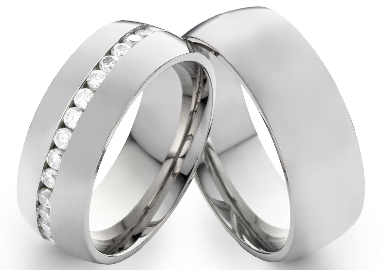Mit diesen Partnerringen aus Edelstahl liegt man immer auf der richtigen Seite. Der Damenring hat eine Breite von 7,5mm und der Herrenring ist 8mm breit. Diese Verlobungsring sind auf der Oberfläche außen Poliert und innen Poliert. Ein Highlight ist der Damenring auf dem rundum runde Zirkonias eingefasst sind. Die Steine haben eine Größe von jeweilss 1,25mm. Um die Verbindung zwischen den beiden Trägern zusätzlich darzustellen, kann man auf der Innenseite eine Gravur anbringen lassen. Durch sieben Schriftarten wird diese individuell formuliert, ganz nach Wunsch. Ein schwarzes Etui ist im Lieferumfang enthalten. Die deutschlandweiten Versandkosten sind ebenso kostenfrei.