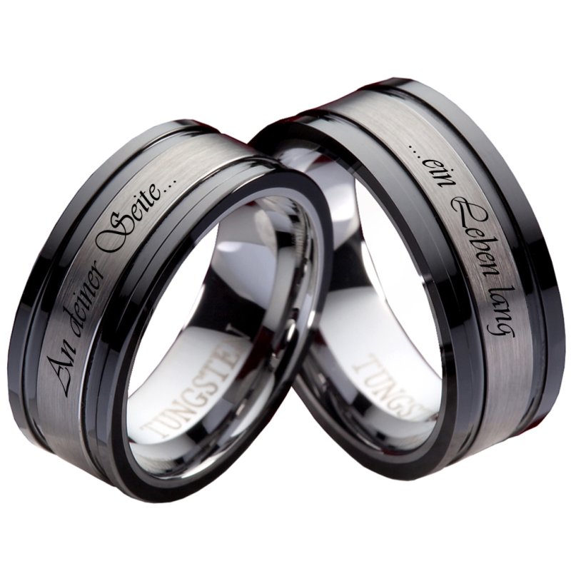 Diese Partnerringe aus Wolfram haben eine Breite von 8,0 mm und sind auf der Außenfläche mattiert und teilweise schwarz beschichtet. Dadurch fallen diese markanten Verlobungs- oder Freundschaftsringe sofort auf. Ein zusätzliches Highlight ist die Gravur, die kostenfrei durch einen Laser an der Oberfläche außen angebracht werden kann. Diese Nachricht verbindet die beiden Träger noch mehr miteinander. Mittels 30 Zeichen und sieben Schriftarten kann man seine Gefühle zum Ausdruck bringen. Im Lieferumfang dieser Wolframringe ist ein edles schwarzes Etui enthalten. Die Versandkosten innerhalb von ganz Deutschland sind ebenfalls inklusive.