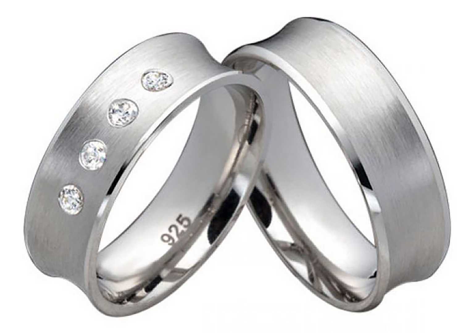 Diese wunderschönen Partnerringe sind aus 925er Sterling Silber und an der Oberfläche außen mattiert und auf der Innenseite poliert. Der Damenring hat vier glitzernd weiße Zirkonias mit einer Steingröße von jeweilss 1,5mm. Beide Ringe sind 6,0 mm breit und auf der Innenfläche gratis gravierbar. Dafür stehen sieben Schriftarten zur Wahl. Die Innenseite ist zusätzlich abgerundet, so dass ein angenehmes Tragegefühl garantiert wird. Die Silberringe aus dem Hause Costina werden in einem edlen schwarzen Etui geliefert. Die Versandkosten innerhalb von Deutschland sind im Angebot enthalten. Die Ringe können auch als Verlobungsringe, Trauringe oder Freundschaftsringe getragen werden. Verlobungsring Silber mattierter Oberflaeche und gratis Gravur.