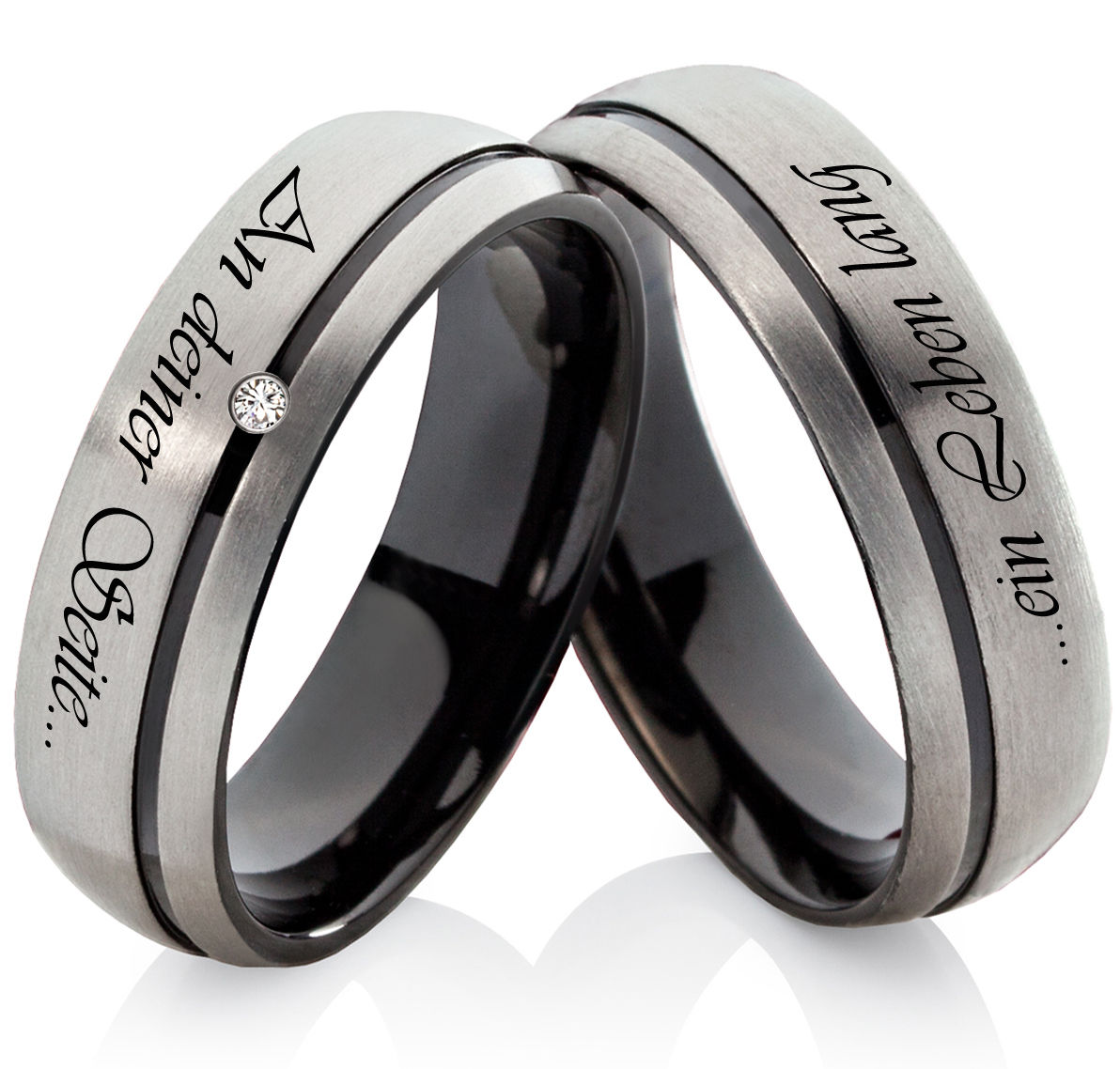 Diese Titanringe, in einem sehr einzigartigen Design, stehen als Zeichen der Verbundenheit und Liebe. Die Oberfläche der Ringe ist mattiert und teilweise mit schwarzer Oberfläche überzogen. Die Optik der Ringe wird noch unterstützt von der besonderen Gravur auf der mattierten Oberfläche. Diese wird mit einen Laser gefertigt. Auch die Innenseite kann mit einer persönlichen Gravur versehen werden. Die Innenseite ist abgerundet und poliert. Es wird auch ein gratis Etui mitgesendet. Diese Ringe können als Partnerringe, Verlobungsringe, Freundschaftsringe oder aber auch als Eheringe getragen werden.