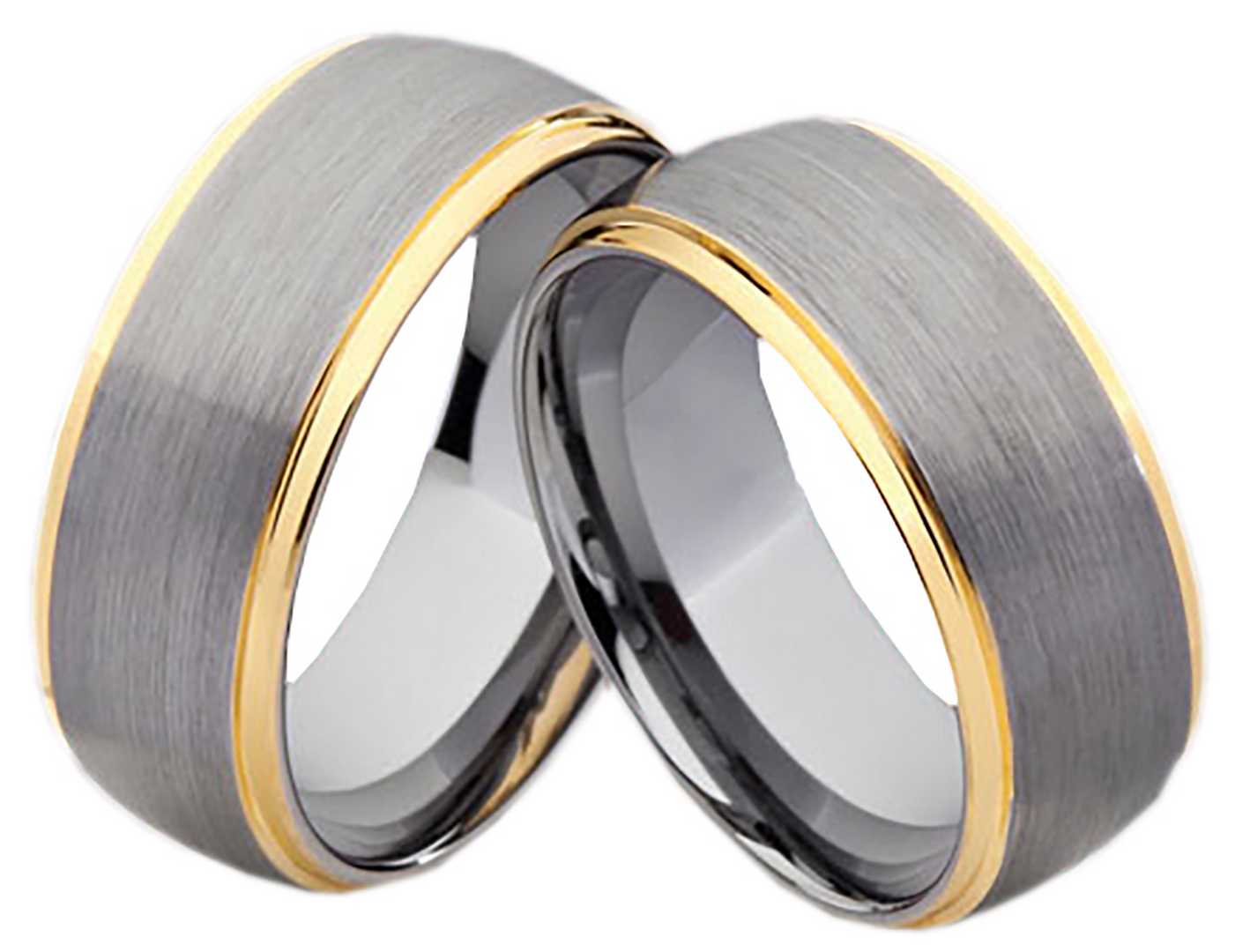 Diese Trauringe aus Wolfram, mit einer goldfarbigen polierten Oberfläche, machen jeden Tag zu einem Highlight. Die 8mm breiten Ringe haben eine Stärke von 2,3mm. Einen angenehmen Tragekomfort bieten die Ringe durch die abgerundete Innenfläche - die sogenannte Bombierung. Das Design erhalten sie durch die leicht gewölbte Form. Die Ringe sind extrem kratzfest, aber leider nicht Stoßfest. Dieses Paar wird aus einem Guss hergestellt und kann nicht nachgearbeitet werden. Die Schmuckstücke werden in einem kostenlosen Etui versendet. Tragen Sie diese Ringe als Partnerringe, Verlobungsringe, Freundschaftsringe oder auch als Eheringe. Diese zweifarbigen Wolframringe ohne Stein und Gravur können Sie hier kaufen.Ringmodell: W135